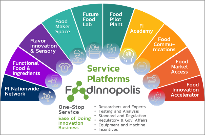 เมืองนวัตกรรมอาหาร (Food Innopolis) หน่วยงานสนับสนุนการวิจัย พัฒนาและนวัตกรรมด้านอาหารแบบครบวงจรให้แก่ผู้ประกอบการในอุตสาหกรรมอาหาร และอุตสาหกรรมที่เกี่ยวข้องทุกขนาด ไม่ว่าจะเป็นผู้ประกอบในระดับ Startups SMEs บริษัทขนาดใหญ่ และบริษัทต่างชาติที่ต้องการลงทุนในประเทศไทย โดยเมืองนวัตกรรมอาหาร มีการทำงานแบบบูรณาการร่วมกับหน่วยงานเครือข่ายทั้งภาครัฐ ภาคเอกชน และมหาวิทยาลัย เพื่อให้เกิดระบบนิเวศน์การวิจัยที่เหมาะสมต่อการทำวิจัย พัฒนาและนวัตกรรม